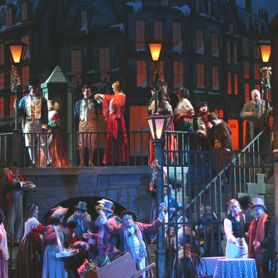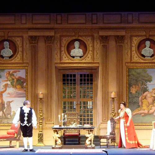 Tri-Cities Opera company builds and maintains its own stock of opera sets and costumes available for rental. Located in Binghamton, New York, our scene shop is a 10,000 square foot, fully-equipped facility. Our technical staff of designers, painters, carpenters and riggers are fully capable of fulfilling all of your design needs. Tri-Cities Opera also coordinates the preparation, alteration, transportation, and subsequent cleaning of individual costumes and full plots spanning the operatic repertoire. You can browse our production stock below, and click on the buttons for full details.